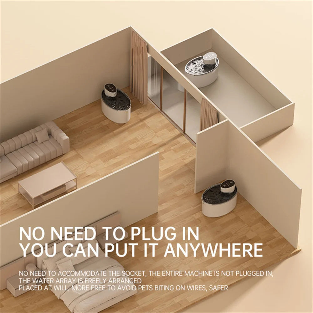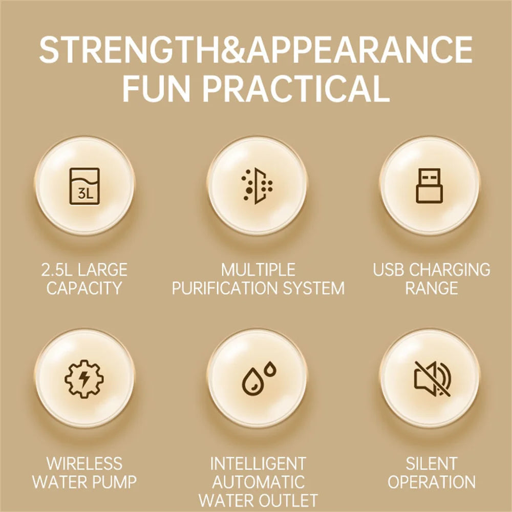 Experience the future of pet hydration with this intelligent 2.5-litre water fountain featuring long strip charging design and automatic induction technology. Perfect for cats and dogs, this silent electric fountain ensures your pets always have access to fresh, filtered water.