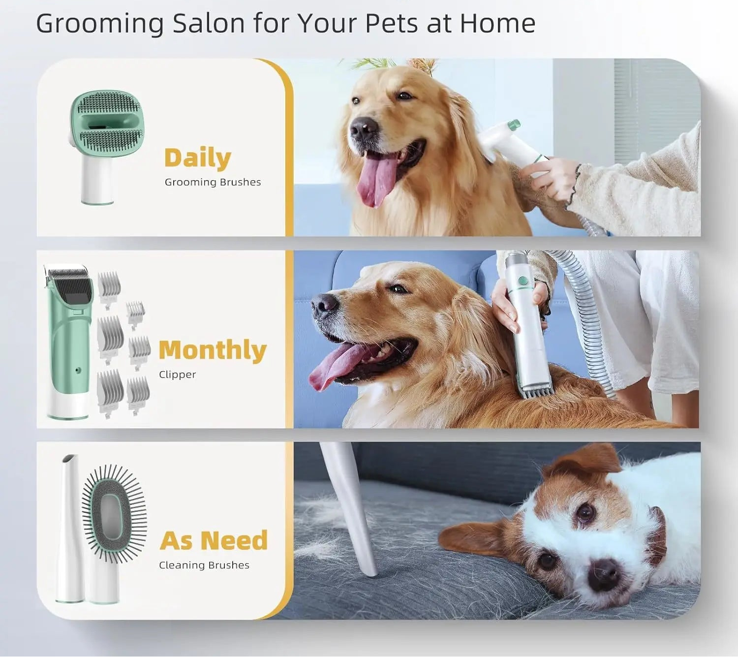 | Double Coat | Deshedding brush, Grooming brush | High suction |