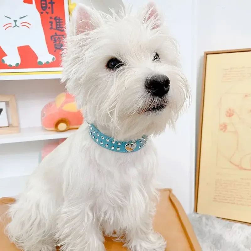 Add a touch of glamour to your pet's wardrobe with this charming rhinestone heart collar. Crafted from soft PU leather and adorned with sparkling rhinestone hearts, this fashionable collar is perfect for small dogs and cats who deserve to shine at parties, special occasions, or everyday wear.