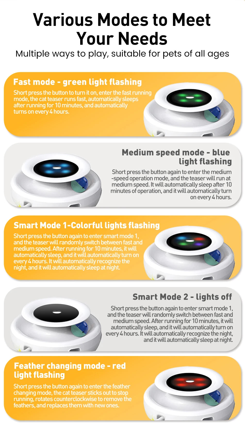 - 5 Interactive Modes: Multiple play patterns to keep pets engaged and prevent boredom