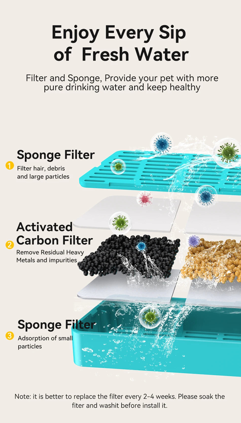 Maintenance: Replace filter every 2-4 weeks. Clean fountain weekly for optimal performance.