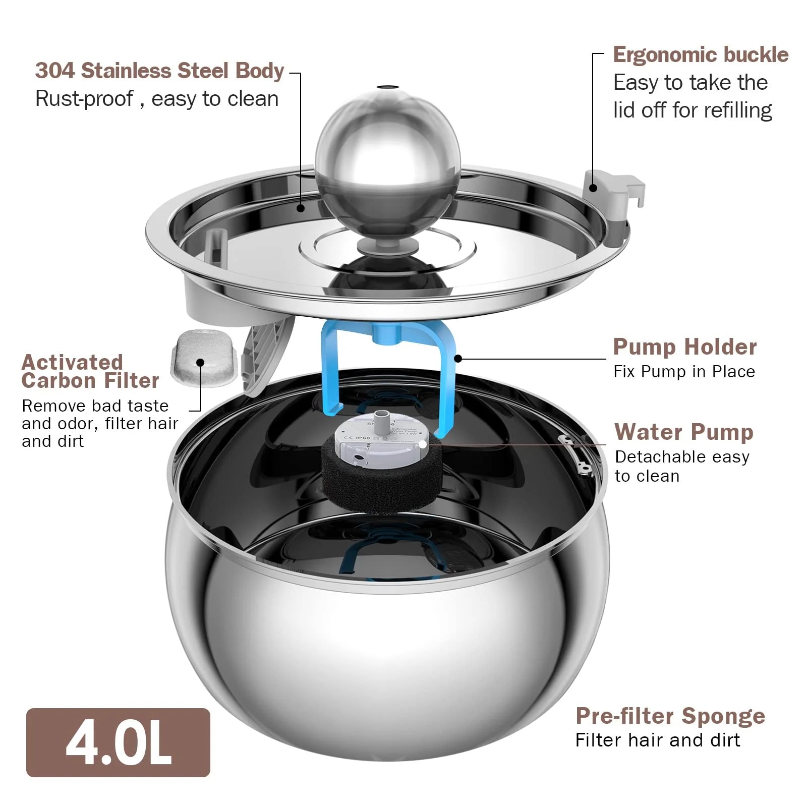 Encourage healthy drinking habits with this elegant 4L stainless steel water fountain featuring a transparent viewing window. The silent operation and continuous water circulation keep your cats and dogs hydrated with fresh, oxygenated water throughout the day.